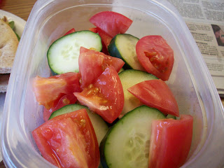 I thought I'd give tuna salad another chance at lunch today. This time I paired it with a whole wheat pita, and spinach. I couldn't fit all of the tuna salad between the pita halves ( I tried opening it, but it just broke, i'm not so graceful). I also had my trusty tupperware full of veggies. Mixed up a little bit today with tomatoes, cukes, red peppers and carrots.
